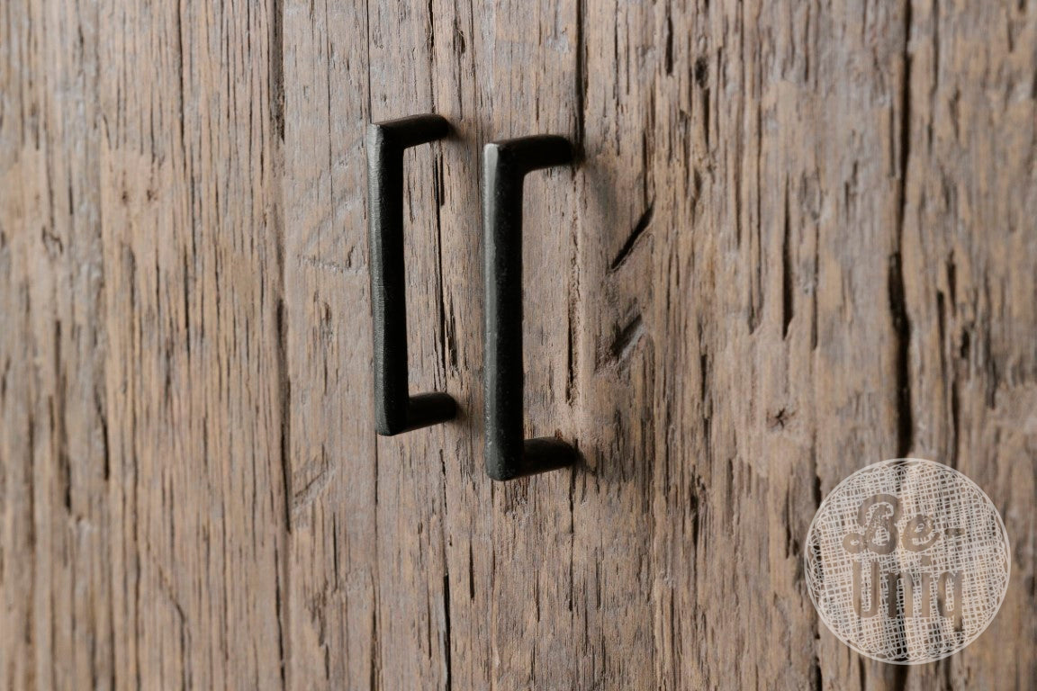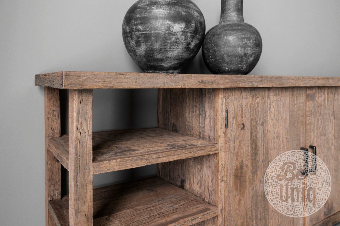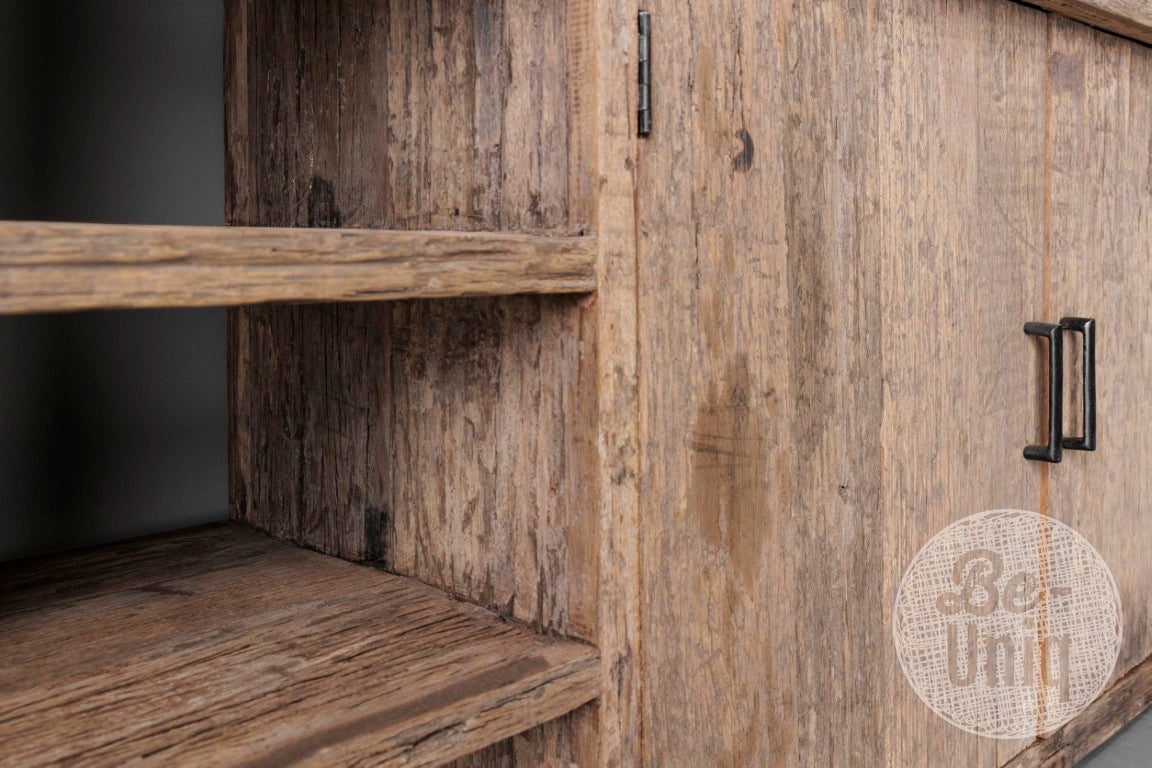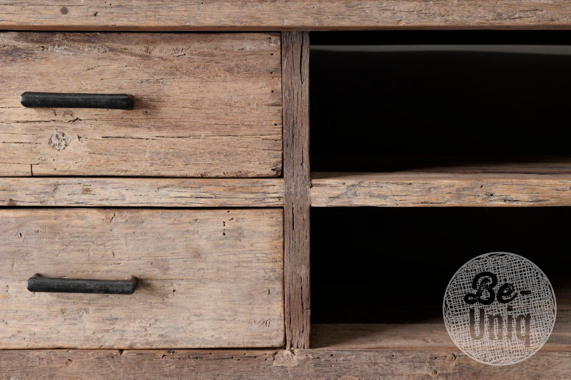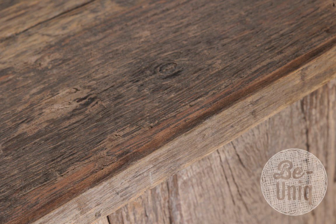 Robuust oud houten badkamermeubel van oud hout met dubbele deuren, opberglades en open vakken. Zeer veel opbergruimte en heel erg stoer.