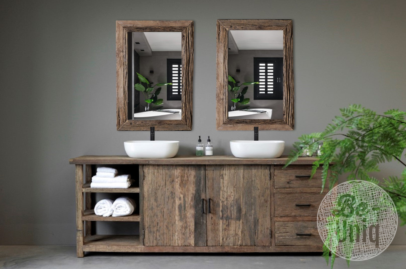 Het badkamer meubel is gemaakt van rustiek oud hout. Dit meubel heeft erg veel opbergruimte door de dubbele deuren, de lades en de open vakken.